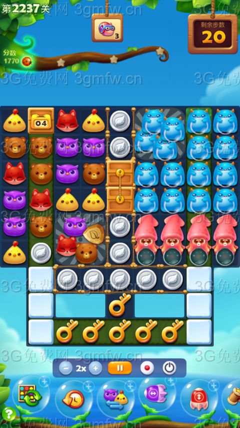 清除特效收集钥匙后蜗牛才能出现。然后就是一直消除莲花出的特效,既能不断上分,又可以造成连消送蜗牛回家。