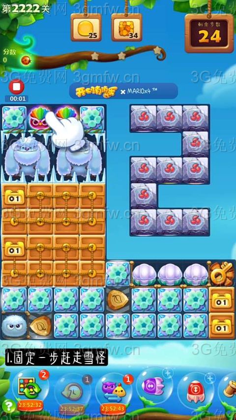 第一步快速解决中间冰块,攻击大炮,让炮弹轰炸。