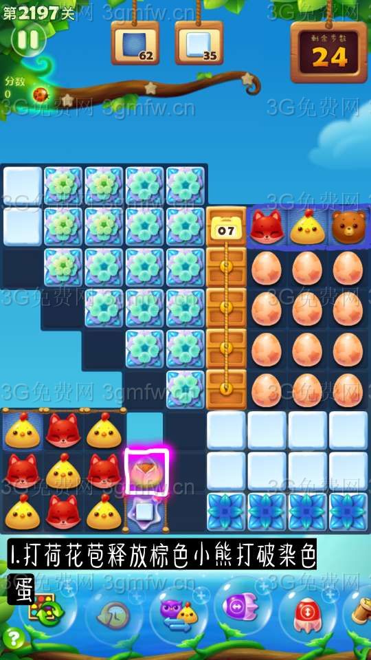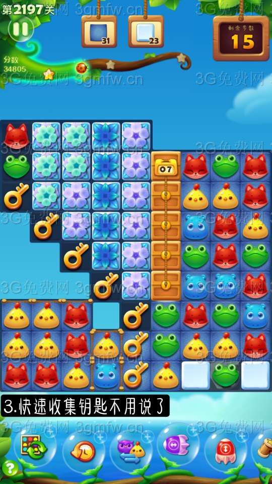 开心消消乐第2197关怎么打?开心消消乐是消除Q萌可爱的小动物们,将三个及以上相同颜色的小动物连成一条直线即可消除,老少皆宜!不会闯关的玩家快来看看G7小编带来的第2197关攻略吧!