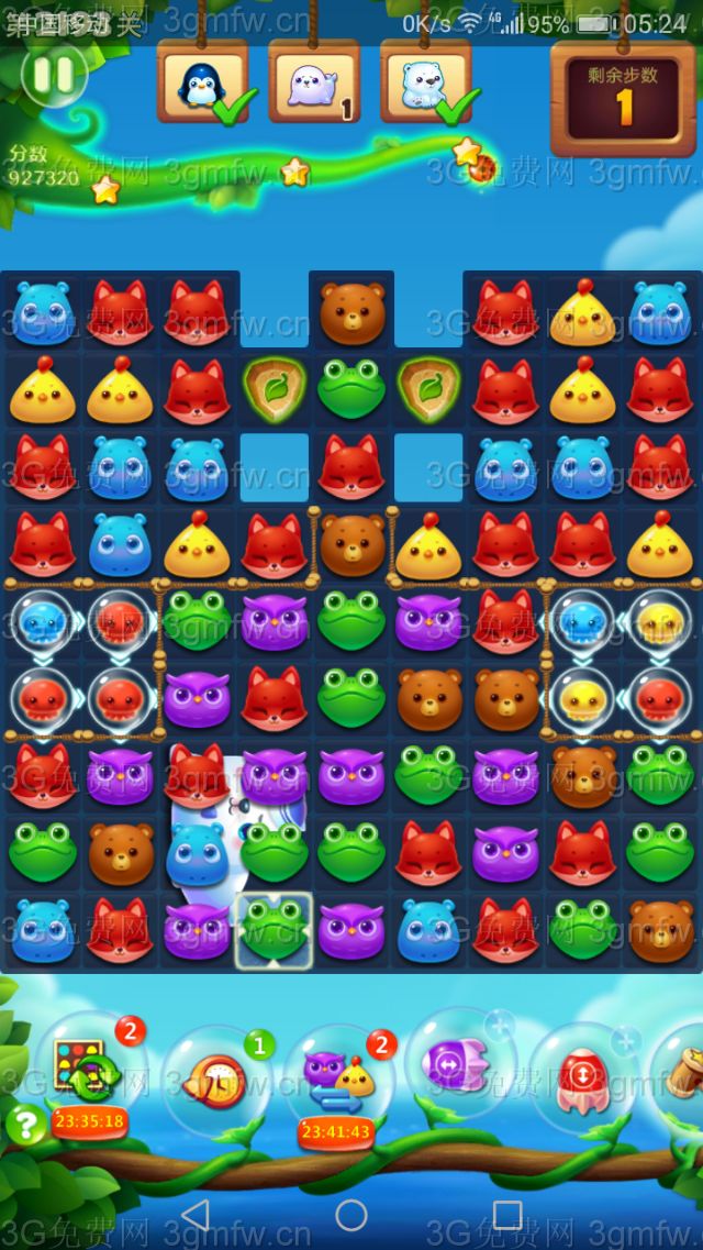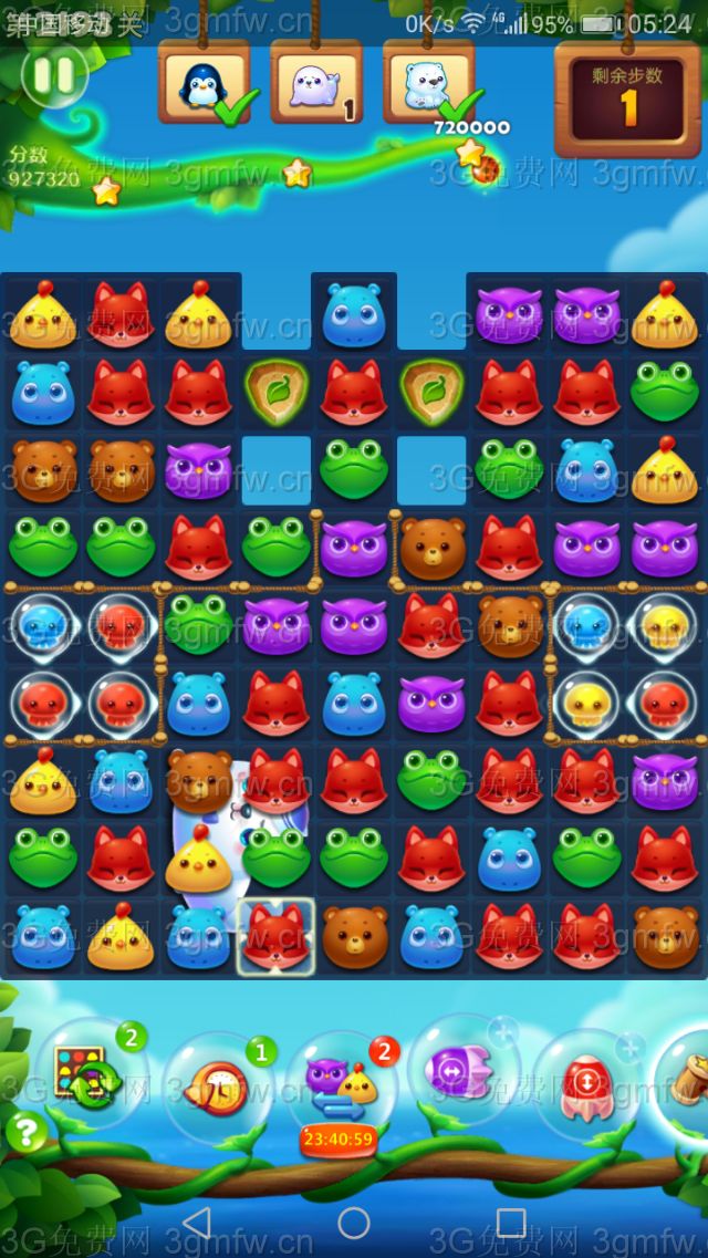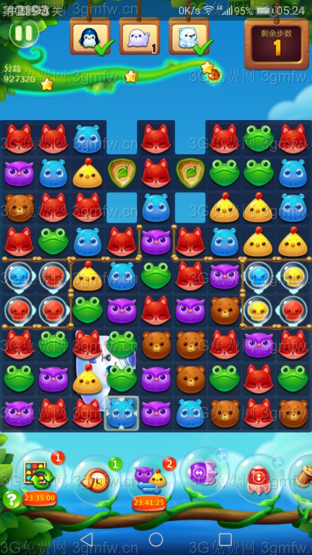 最后一只海豹尾部的冰块用了两个刷新也没消掉,如果再有一步魔力鸟单吸就能过关了,其实应该用木槌敲掉青娃,上边两只狐狸下落与下边狐狸形成三消就过了。