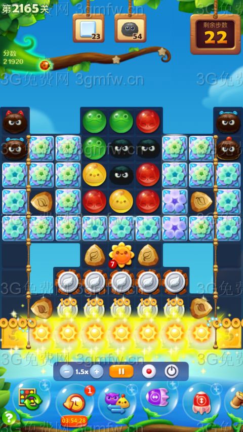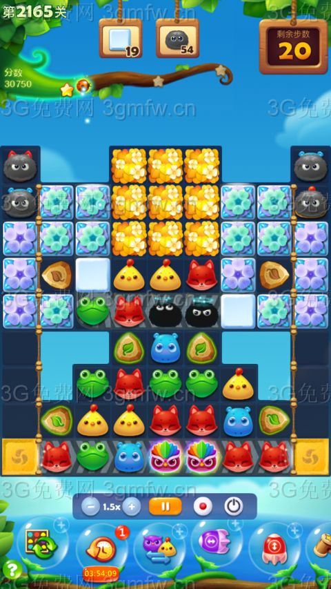 幸运裸过三星。没有坑按部就班就行。先在中上方走两步消冰块,然后闪电鸟会自动链接消掉太阳瓶,清屏后树叶盖住中上部,但是不厚很容易破开。然后就暴打魔法石,冰块不是问题,黑毛球数量要求比较多,靠魔法石消灭比较慢,最好有特效就容易了。这关又组了双鸟,不敢相信自己的眼睛。