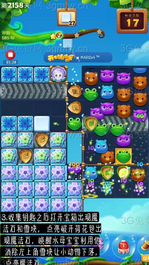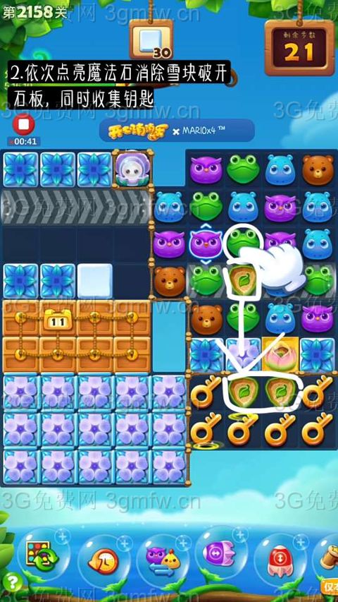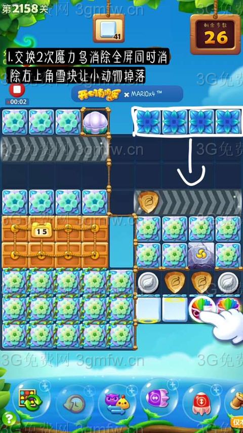 1.开始交换2次魔力鸟消除全屏同时消除雪块让小动物掉落。
