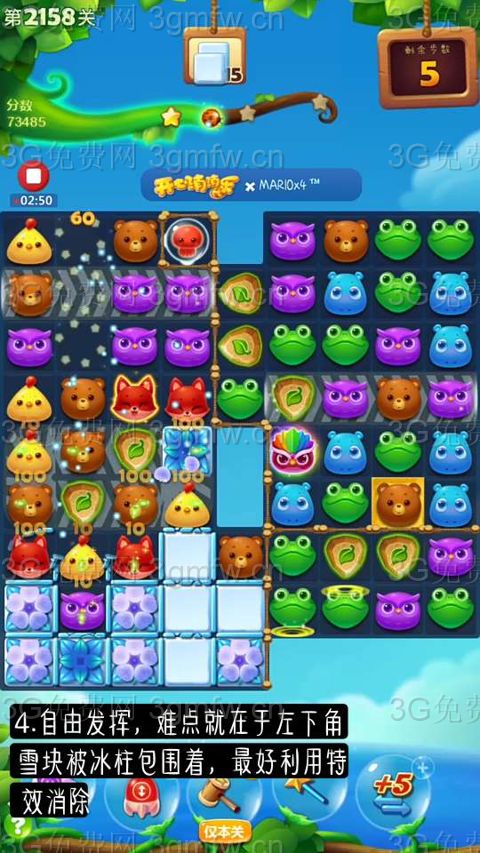 4剩下自由发挥,.难点在于左下角雪块被冰柱包围 利用特效消除。