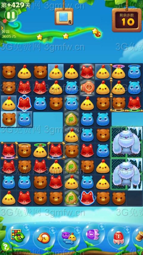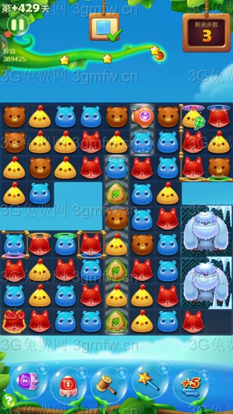 买+3步。开始在左下角闲走3步,等翻转石门盖住两只大雪熊,互换底下两只红狐狸特效打开局面。在左下角组竖直向上特效和爆炸特效互换消除雪块,顶部激发大炮特效消除雪块。左上角有一两块雪块厚,组魔力鸟单吸雪块中同样的小动物。玩了几次,过关了。